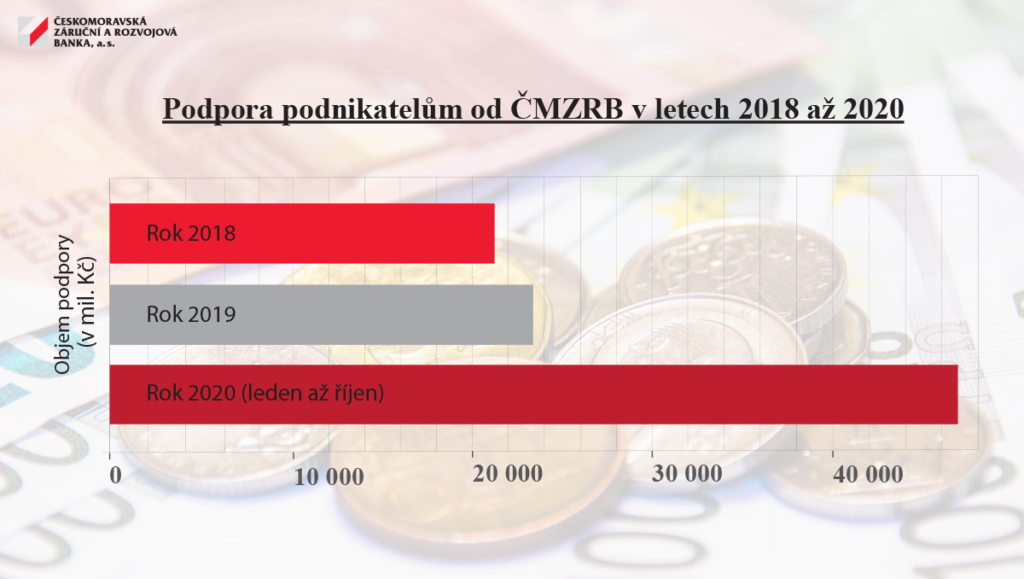 Přes dvě třetiny podpory, kterou ČMZRB ve spolupráci s komerčním sektorem v letošním roce podnikatelům poskytla, směřovala z programů COVID. Do konce října letošního roku tak bylo schváleno více než 6 200 žádostí v objemu 32,6 mld. Kč napřímo poskytnutých nebo zaručených úvěrů. Dalších více než 14 miliard Kč získali podnikatelé z běžných programů banky. Podporu z nich čerpalo ve sledovaném období přes 3 400 malých a středně velkých firem.