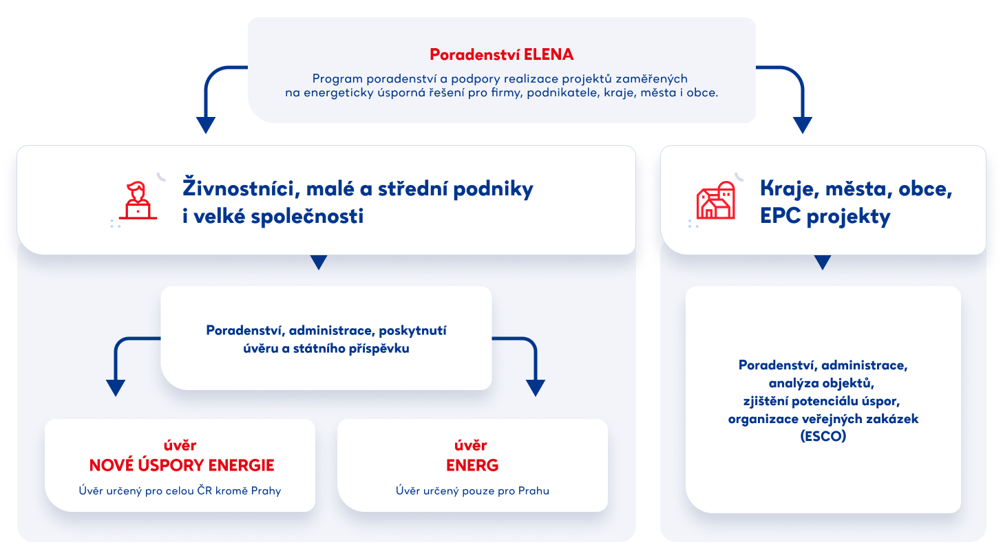Díky programu Nová ELENA mohou podnikatelé využít služeb ověřených energetických poradců, kteří s nimi naplánují a sepíšou projekty zaměřené na vylepšení energetické náročnosti budov (např. zateplení, výměna oken, vytápění nebo ventilace). Tým Nová ELENA jim usnadňuje také kompletaci žádosti o bezúročné financování z programu Úspory energie a ENERG.